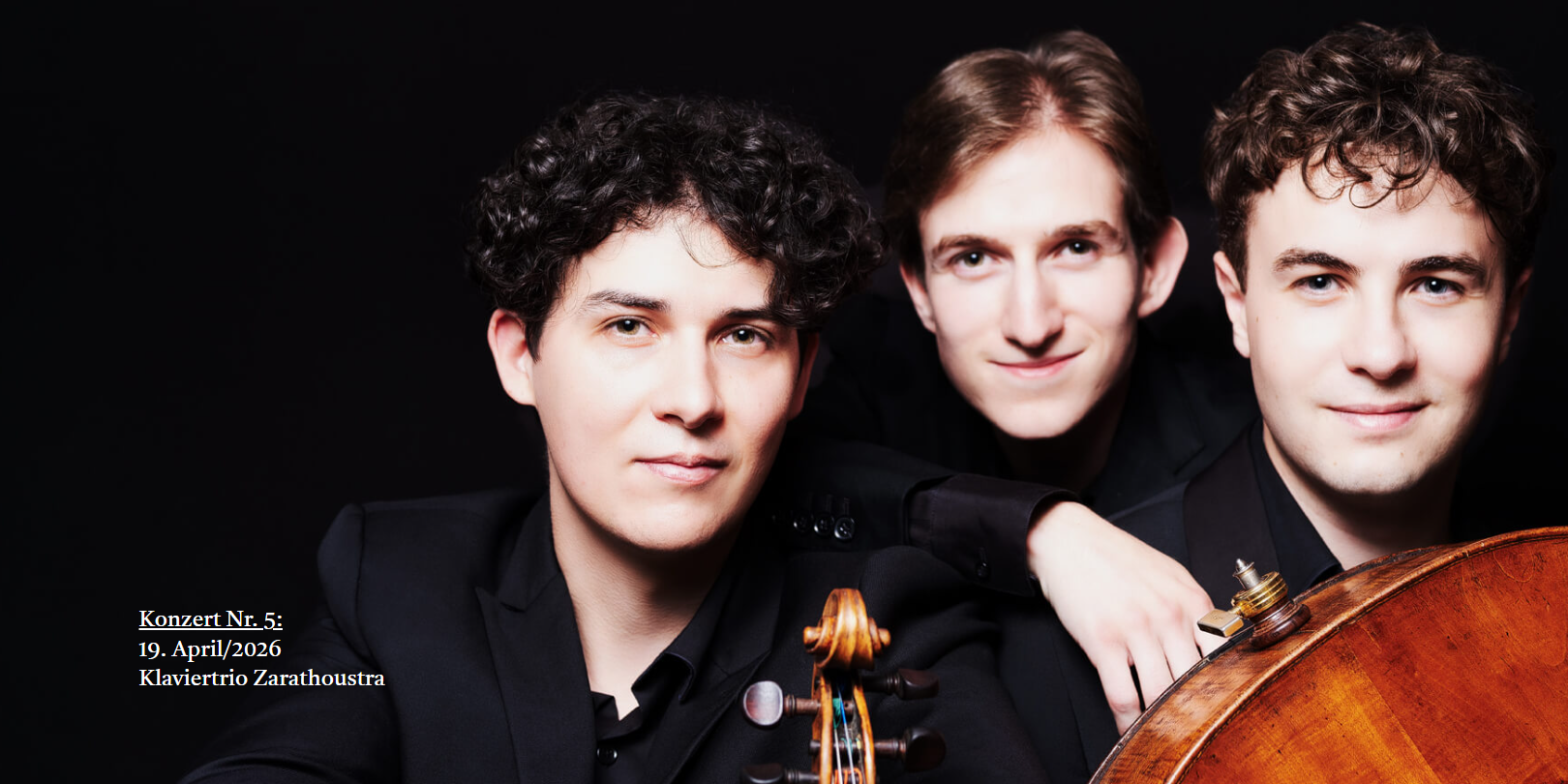 The young piano trio, which was awarded a prize at the Orpheus Competition by the jury under the direction of Heinz Holliger, is working on trios by Franz Schubert and Bohuslav Martinů, mindful of Friedrich Nietzsche's figure Zarathoustra, according to the motto "in search of meaning and beauty." On the program will be piano trios by both composers. Following the concert, the audience will be invited to an apero and conversation with the artists.